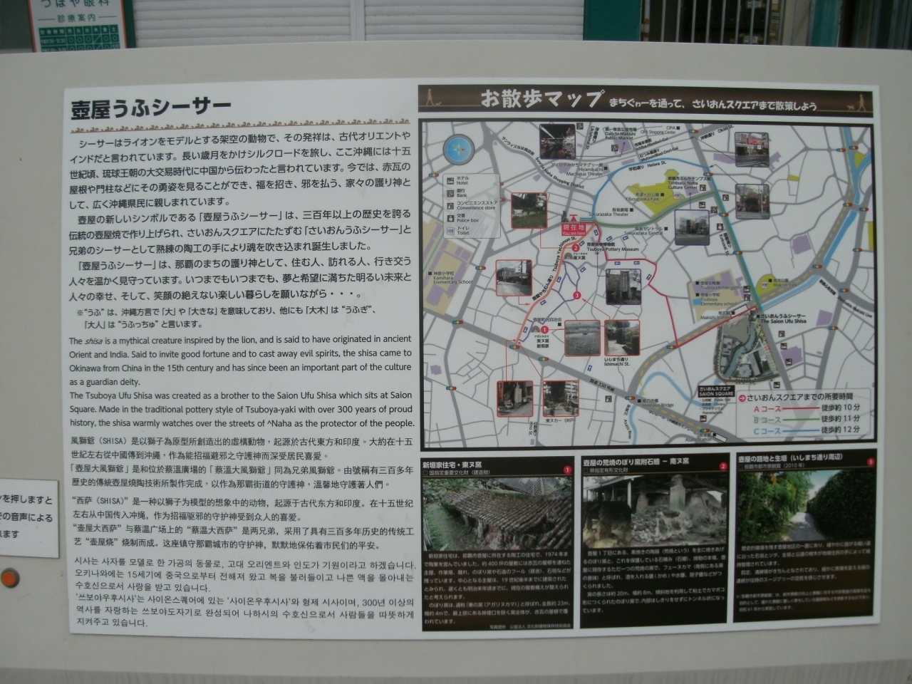 うふシーサーの横には、ボタンを押すと音声案内をする石碑も設置されています。壺屋のやちむん通りを散策するときに立ち寄ってみて下さい。