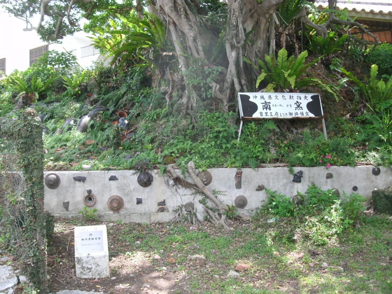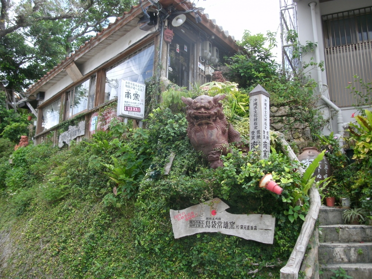 やちむん通りの壷屋焼物博物館を少し過ぎた辺りの道路わき、道よりやや高くなった草木が繁茂する石垣の上にカフェ「南窯(ふぇーぬかま)」があります。