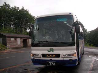 酸ヶ湯温泉に入った後、青森行きのみずうみ号に乗込むと、席は三分の一ぐらい埋まっていて、帰りはバス指定券は不要で普通の路線バスと同じです。酸ヶ湯温泉から少し下ると立派な建物の城ヶ倉温泉に寄って、先ほど降りたロープウェイ駅前に停車し、帰りは萱野茶屋での休憩はなく萱野高原から見る八甲田山には雲がかかっています。