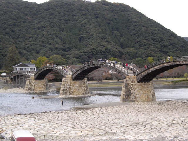 錦帯橋に初めて行きました。以前からガイドブックなどで見ていて、是非一度は渡って見たいとの夢がかないました。その優美な姿は、遠くから見るのも美しく、また渡りはじめると独特のカーブが実感できてそれも感激でした。
