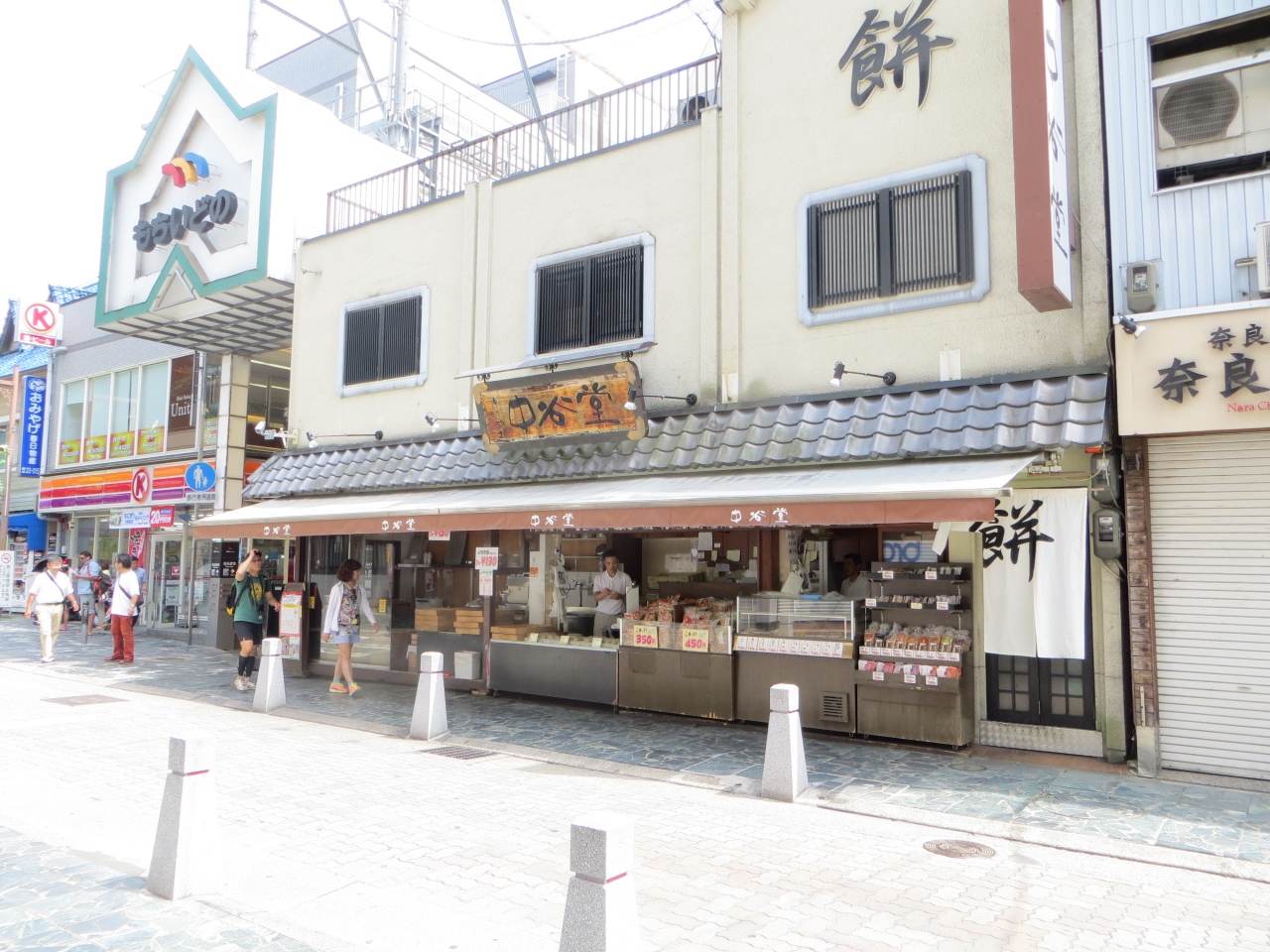 奈良市の三条通、興福寺近くにある和菓子屋さんは店先でお餅を威勢良くついて観光客を引きつけています。こちらの名物はよもぎ餅。つきたてが食べられます。奈良はあまりお店が無いのでそれもあっていつも混雑しています。味はそれほどでもありませんがついつい1個から買えるので買ってしまいます。
