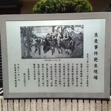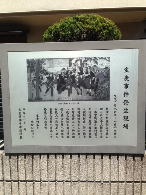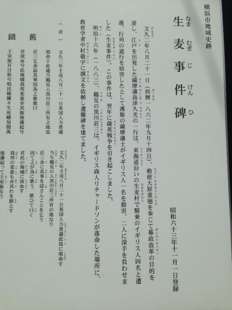 生麦事件によって薩英戦争が起こり、その後、英国の力を盾にして、長州と手を組んだ薩摩が倒幕に動きます。つまり、この生麦事件こそが、日本の行く末に最も大きな影響を与えた事件なのです。実際に生麦事件が起こったのは三枚目のプレートが立っている場所で、事件碑から歩いて6分くらいのところにあります。また、生麦駅近くにあった参考館(四枚目の写真)は2014年の5月に閉館となってしまいました。