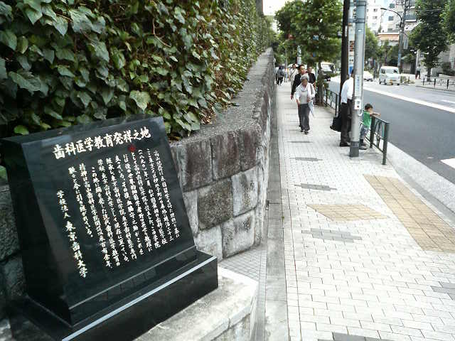 明治の頃、高山紀齋が日本初の歯科医師免許をとり、さらに米国の歯科医師免許も取得した後、この地に歯科医学院を開設し、これが東京歯科大学の前身となったことを記念したものとのこと。