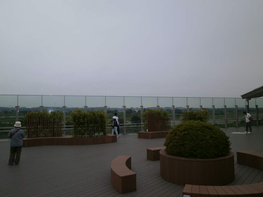 パーキングエリアの建物の外には相模川の河川敷が見えます。