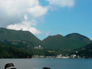出港すると箱根用水の取水口があり、江戸時代にトンネルを掘って静岡側の灌漑用水に芦ノ湖の水を引いています。湖の中央に来ると、駒ケ岳の山頂が見えて、ロープウェイが山頂まで伸びていて、箱根町港が近づくとアンテナのある双子山が見えてきて30分ほどで、箱根駅伝の折り返し地点のある箱根町港に着きました。