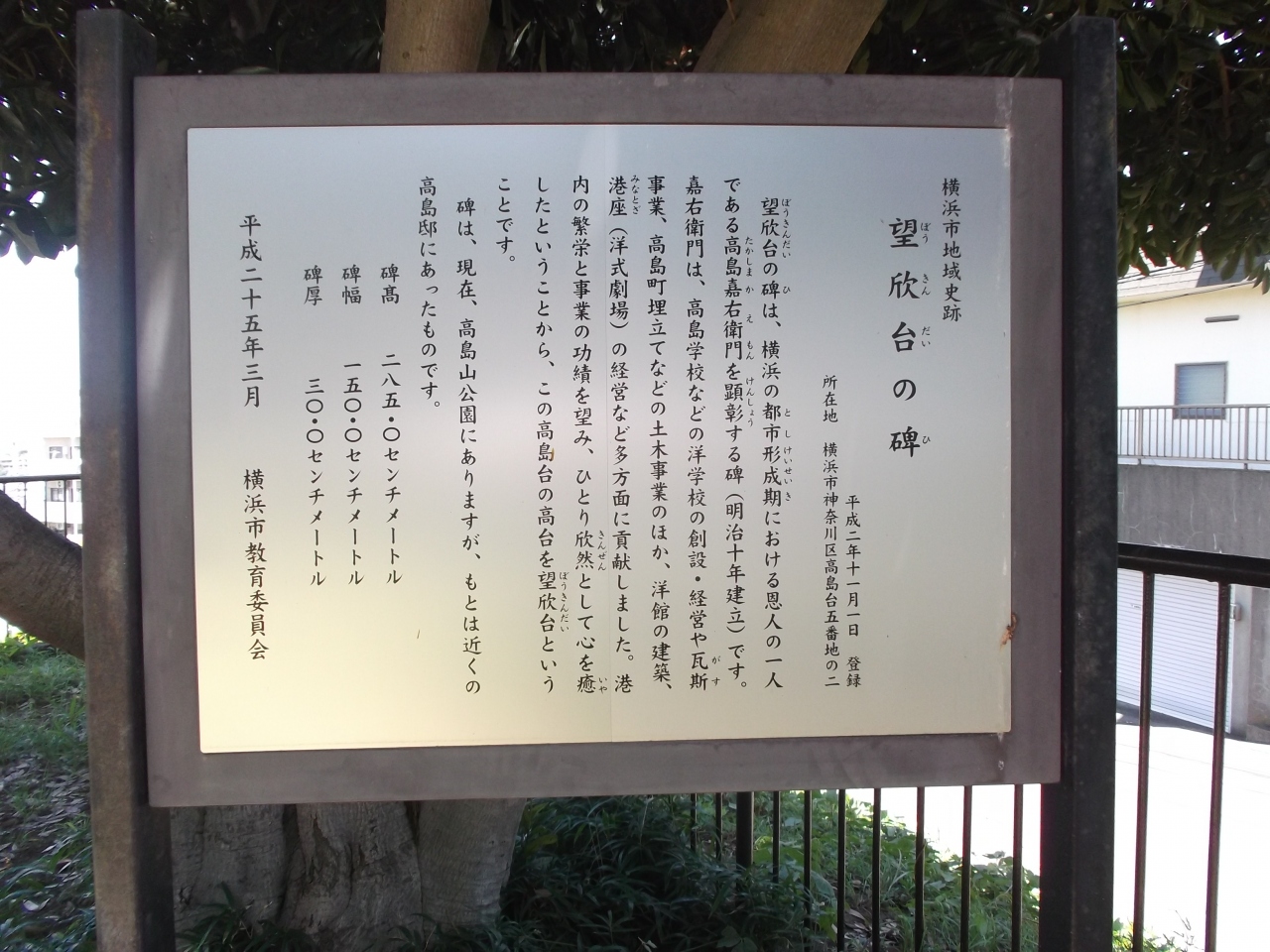 大きな石碑が二つあります。ひとつは望欽台の牌、もうひとつは弁玉歌牌、共に横浜市の解説プレートが付いています。横浜の発展に尽くした高島嘉右衛門のゆかりある貴重な史跡ところでもあります。
