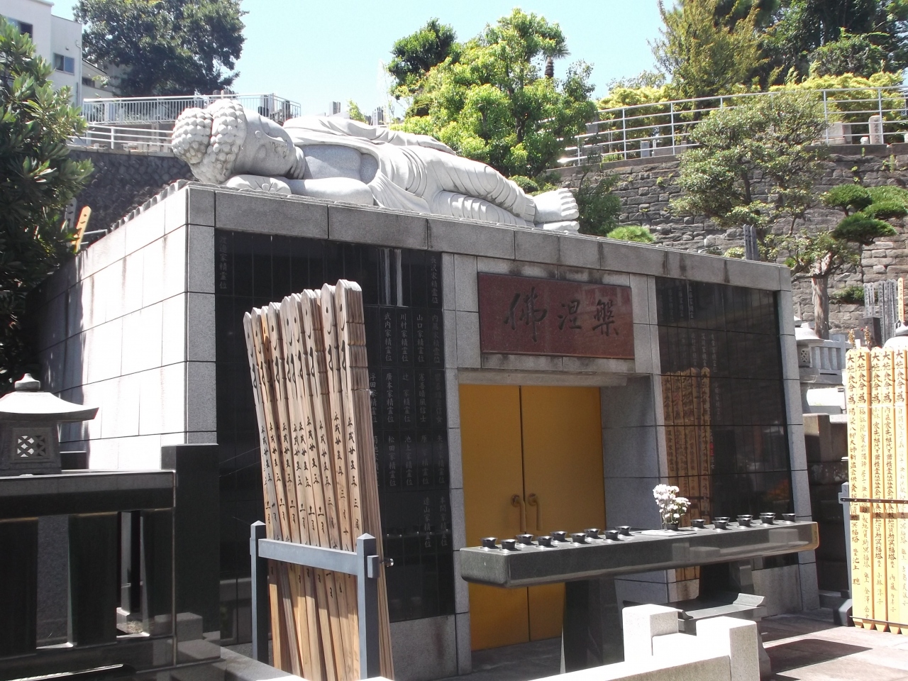 境内は広く、山号「青木山」の本堂と庫裡、お堂・鐘楼が歴史ある古刹を醸し出しています。本堂から見渡す周りは墓地で、釈迦の涅槃仏が目をひきます。