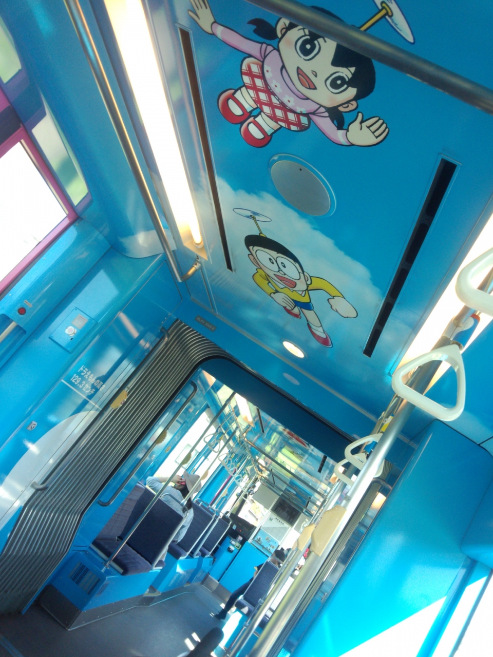 電車は路面電車になっていて、外や車内の天井などにドラえもんやドラミちゃんなどの姿がを見えます。青が基調のかわいい電車です。