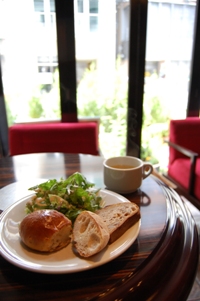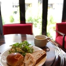まずコンソメスープ、サラダとパンがワンプレートで出てきました。