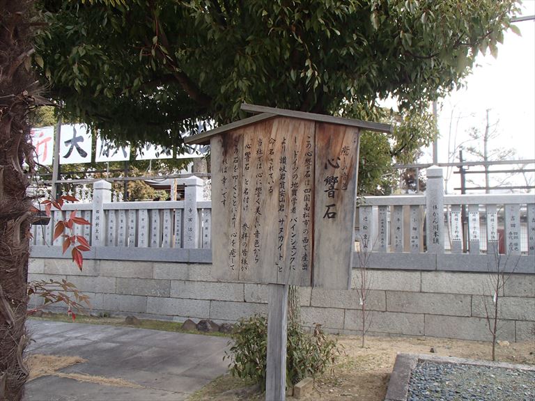 赤穂大石神社 (あこうおおいしじんじゃ)には、心響石が有ります。この心響石は、高松市の西で産出し、サヌカイトと命名された石との事で、心に響く美しい音色から、心響石と、名づけられた様です。ぜひ、一度、行ってみてください。