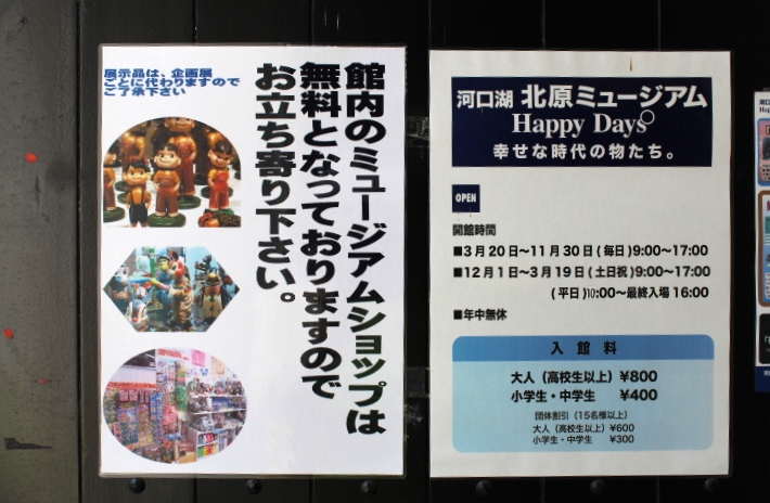 河口湖ハーブフェスティバルに行ったついでに立ち寄りました。大池公園側に大きな看板があり、公園に隣接しています。博物館の入口の前には河口湖に顔を向けてアイビーロデイが立っています。博物館の土産物売り場は無料で入れますので覗いてみました。