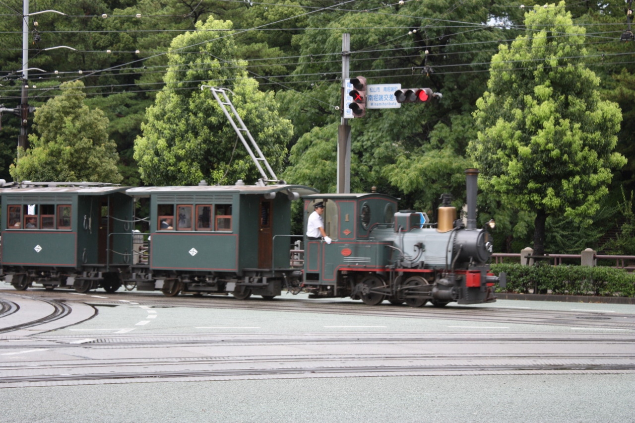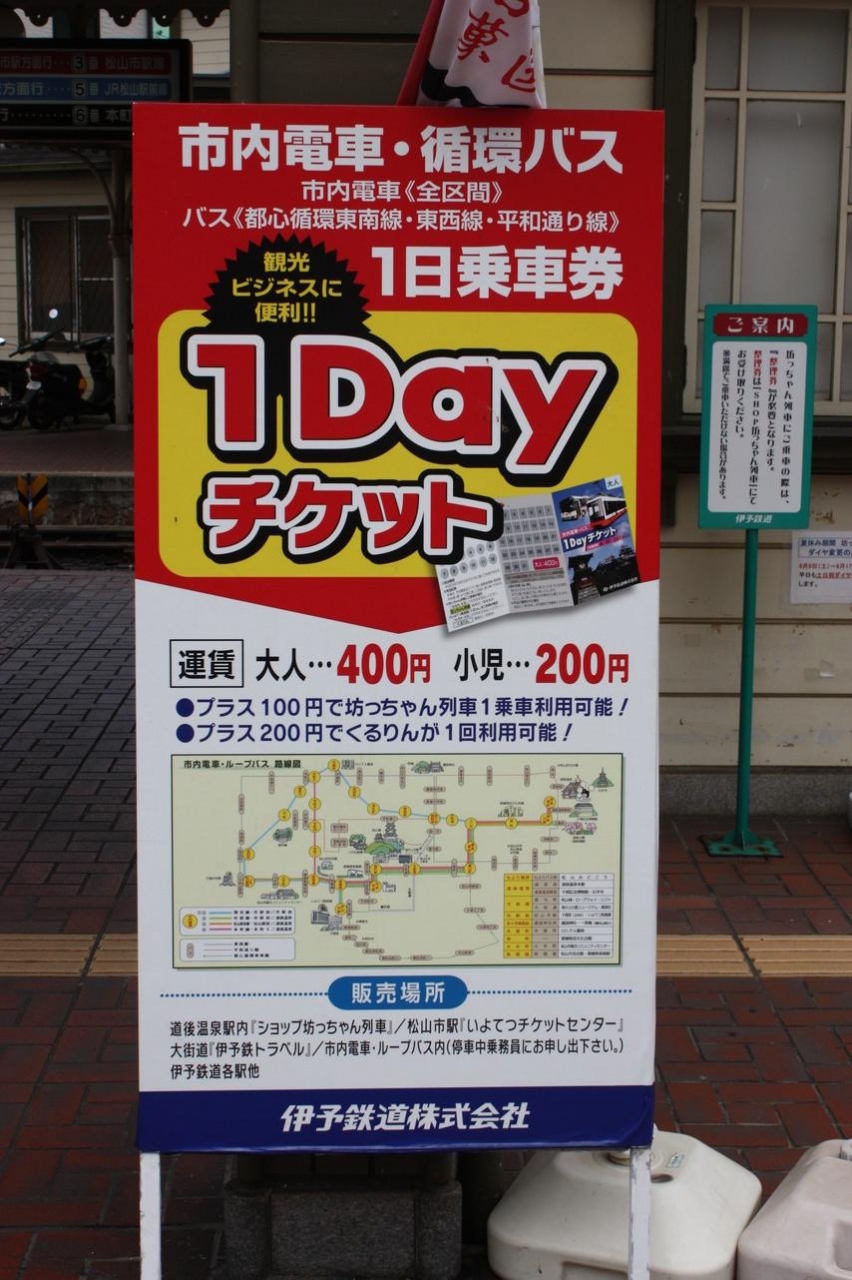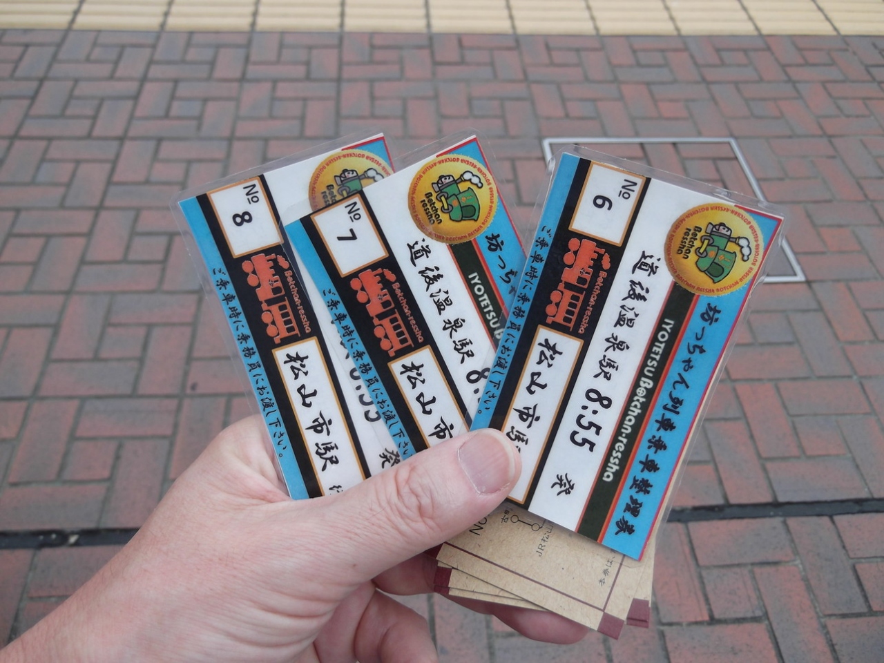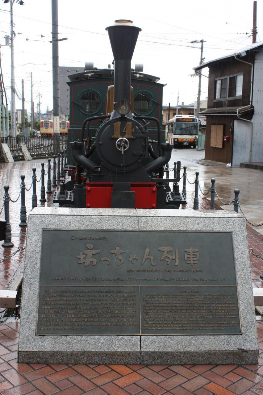 観光用のディーゼルなので、1時間に1本程度の運行です。1号機が客車2両、14号機が客車1両で運行していました。座席は線路の方向に長椅子が壁に沿って2本だけなので、16名ぐらいしか座れません。道後温泉駅でチケットを購入すると整理券が貰え、整理券の番号順に客車に入ります。20番以降だと立ち席だと思われます。坐ると目の前に人が立つので車窓は望めません。180°体をひねってください。終点で降りる方は 機関車の方向転換を見て下さい。機関車自身がターンテーブルを持っています。
