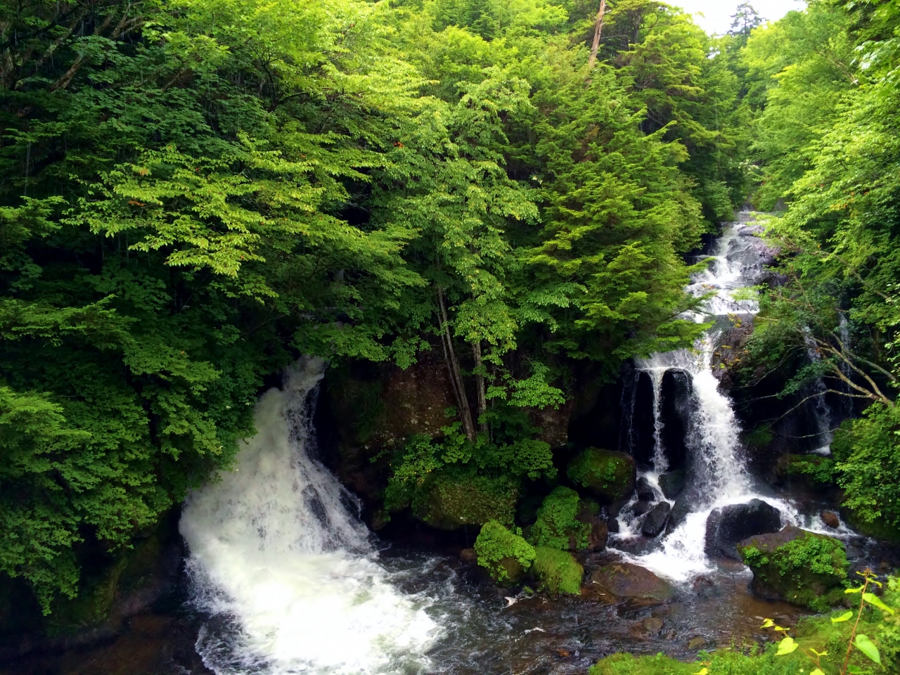 奥日光の湯ノ湖から戦場ヶ原を通って流れる湯川が、男体山の噴火でできた溶岩の上を流れています。