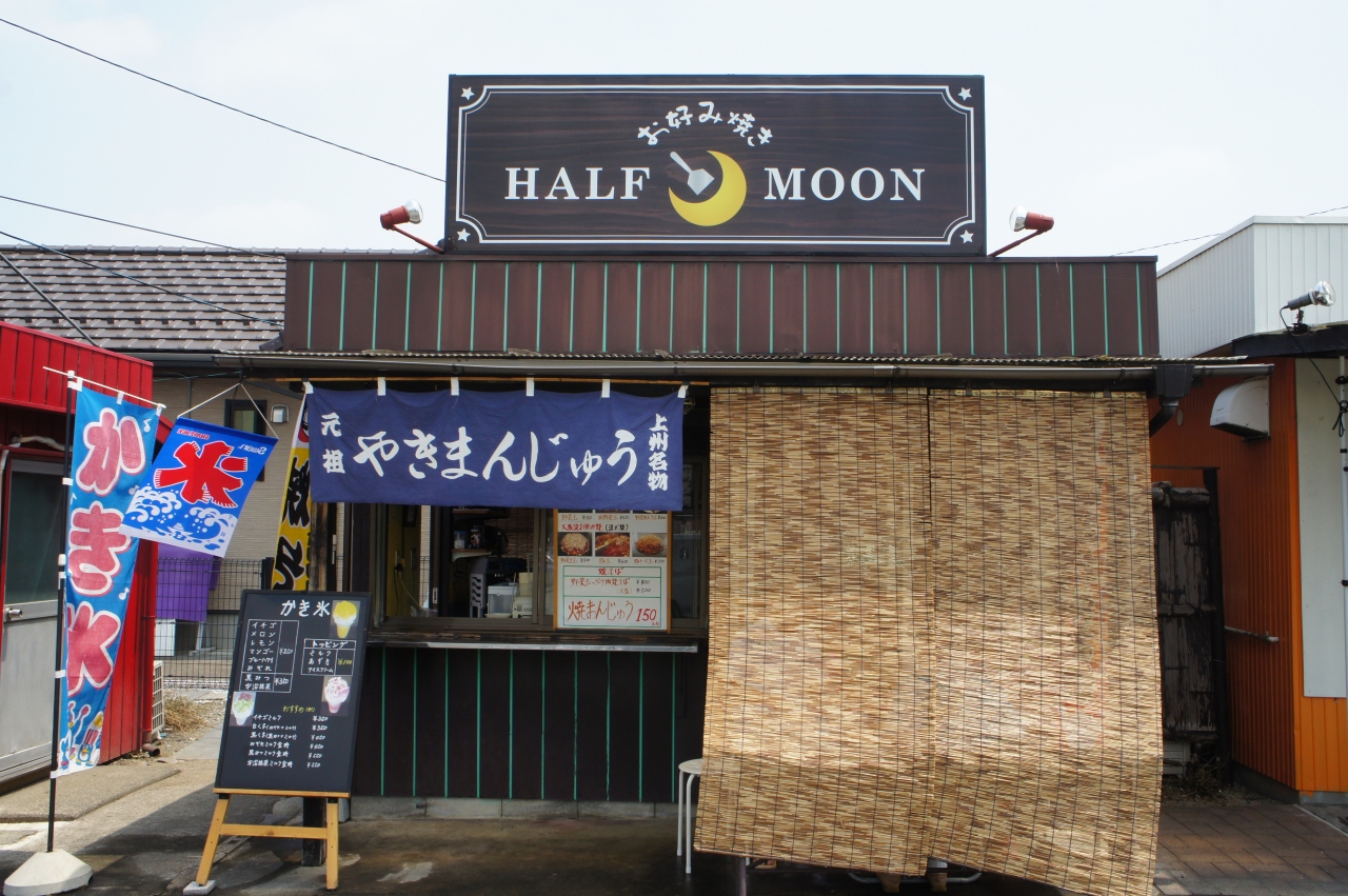 ハーフムーンは、屋台のような店構えで、お好み焼きやかき氷なども扱うお店。兼業なので、焼まんじゅうの方はどうなのかなあとやや気がかりだったのですが、その懸念は無用でした。抜群にうまいというほどではないにしても、ここの焼まんじゅうは、中間でパリッと火の通った感じや味噌の香りの甘いタレなど、群馬の焼まんじゅうの基本的なおいしさを見事に備えていると思います。先入観で判断してはいけませんね。