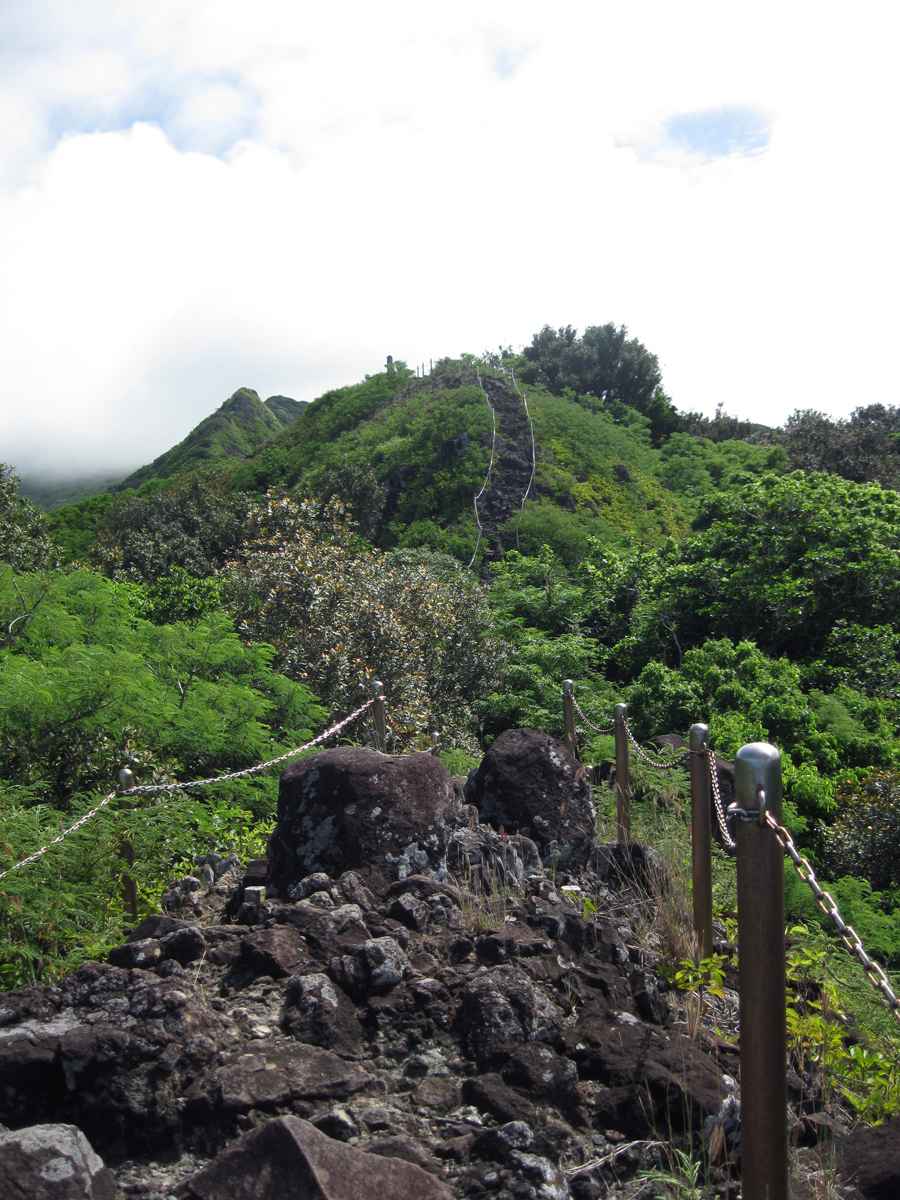 登山口から歩いて1分も経たないうちにジャングル、山頂付近は鎖伝いに登る岩場とバリエーション豊かな登山道です。