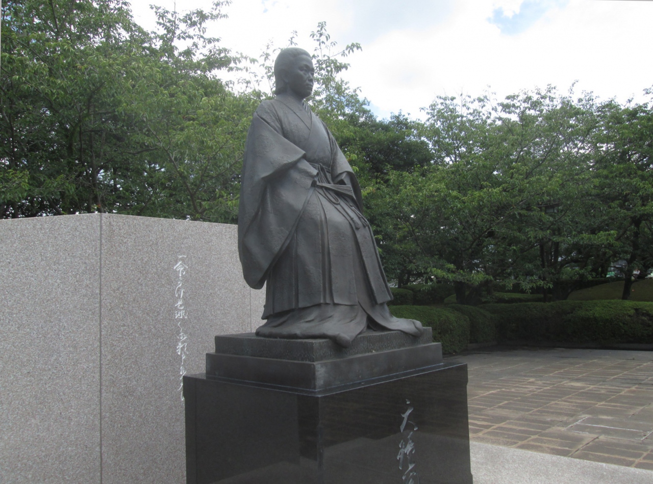「旧鶴丸城」本丸の一角に、真新しい立派な碑がありました。平成22年に建てられた碑とありましたから、NHKドラマから始まった「篤姫」ブームに乗ったのでしょうね。篤姫像の後ろにある屏風には篤姫の略歴が記されていました。
