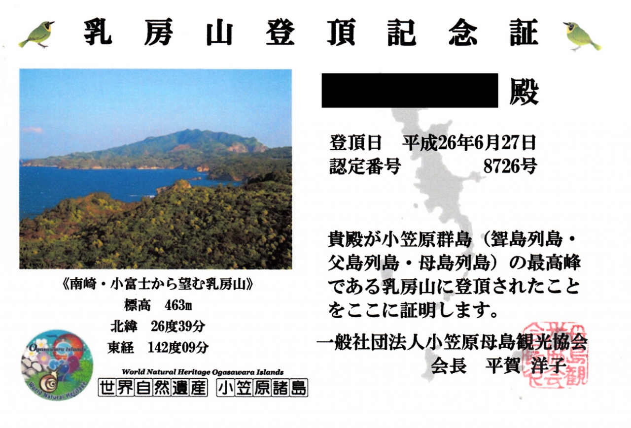 登山前に母島観光協会で手続きを行うと、後日に登頂記念証が送られてきます。