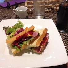 天神西通りにあるカフェ。今回は、ランチパスポートで、ヒッコリーサンドを注文。ランチパスポート用のおざなりメニューのようで、たまご、ベーコン、サラダを挟んだ平凡なサンドウィッチが出てきます。