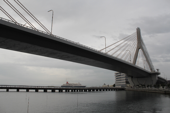 青森ラブリッジは「青函連絡船メモリアルシップ八甲田丸」と青森の臨海公園「青い海公園」とを結ぶ、海上にある遊歩道です。青森ベイブリッジはその上にほぼ平行に架かっています。上下に二つの橋を見渡せるポイントがいくつもあります。