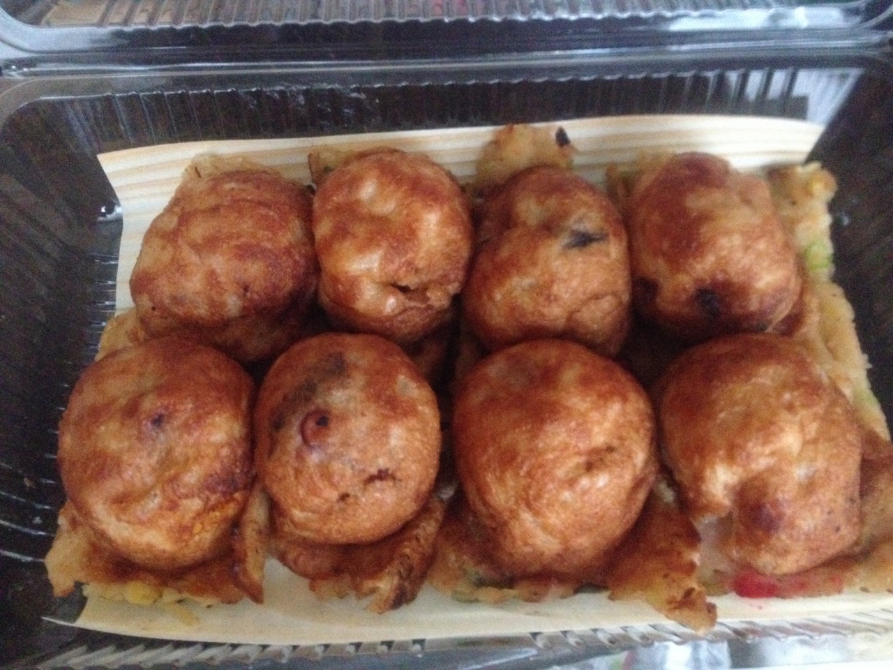 たこ焼きもあり、しょうゆ味とソース味があります。なぜかコーンが入ってます。他のたこ焼き屋さんより、タコが大きいです。たこ焼きは8個で500円。マヨネーズは別料金です。