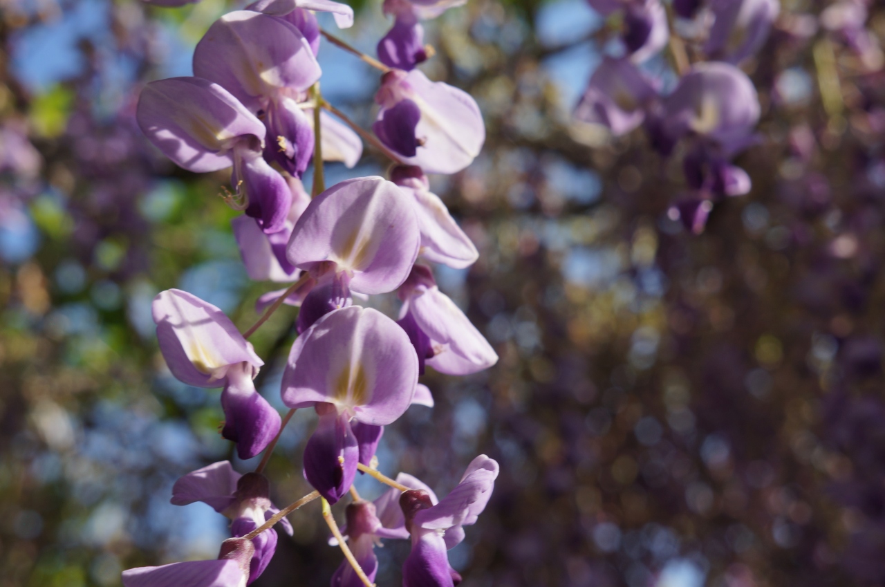 白、ピンク、紫の藤の花房が長く垂れ下がっていて
