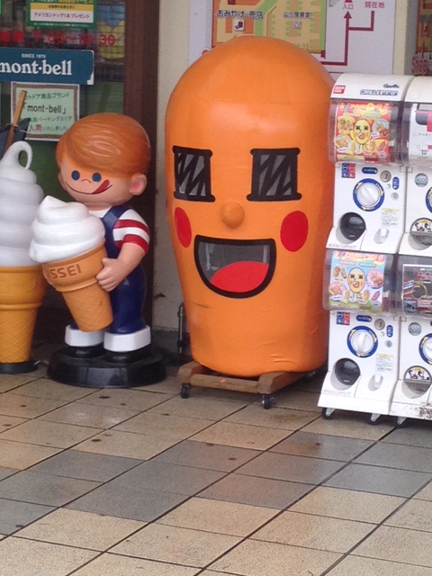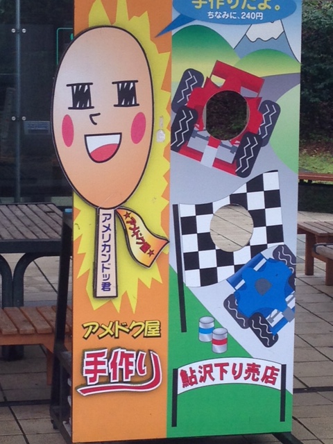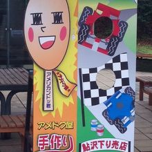 特に新しいパーキングアリアではありませんが、ここにはアメリカンドッ君と呼ばれる人形が飾ってあり、同じ顔を印字してあるアメリカンドックが売られておりユニークです。