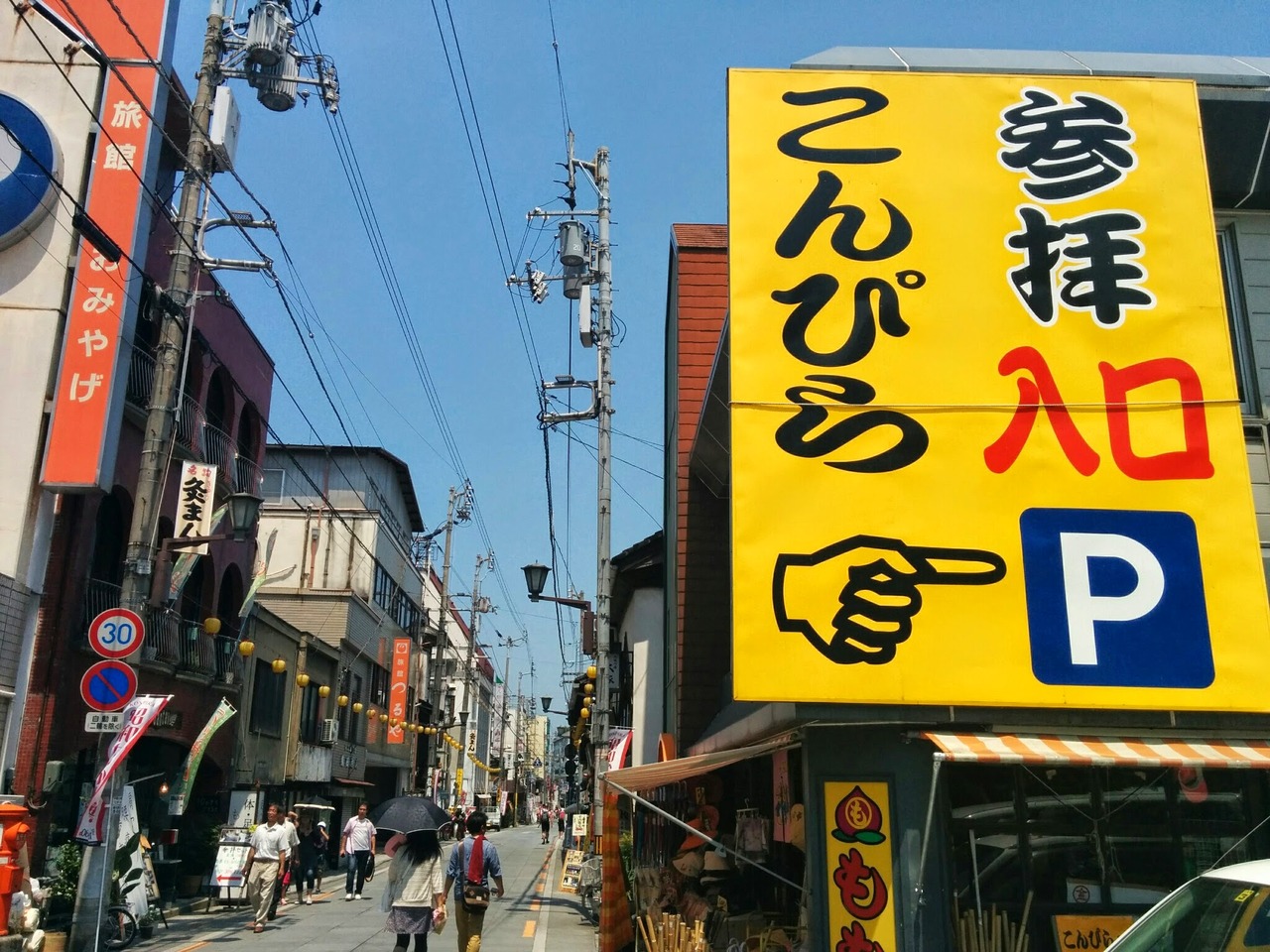 この「一之橋」を渡って、最初の交差点を右に曲がると、《こんぴら参拝入口》と書かれた大きな黄色い看板が目に入る。