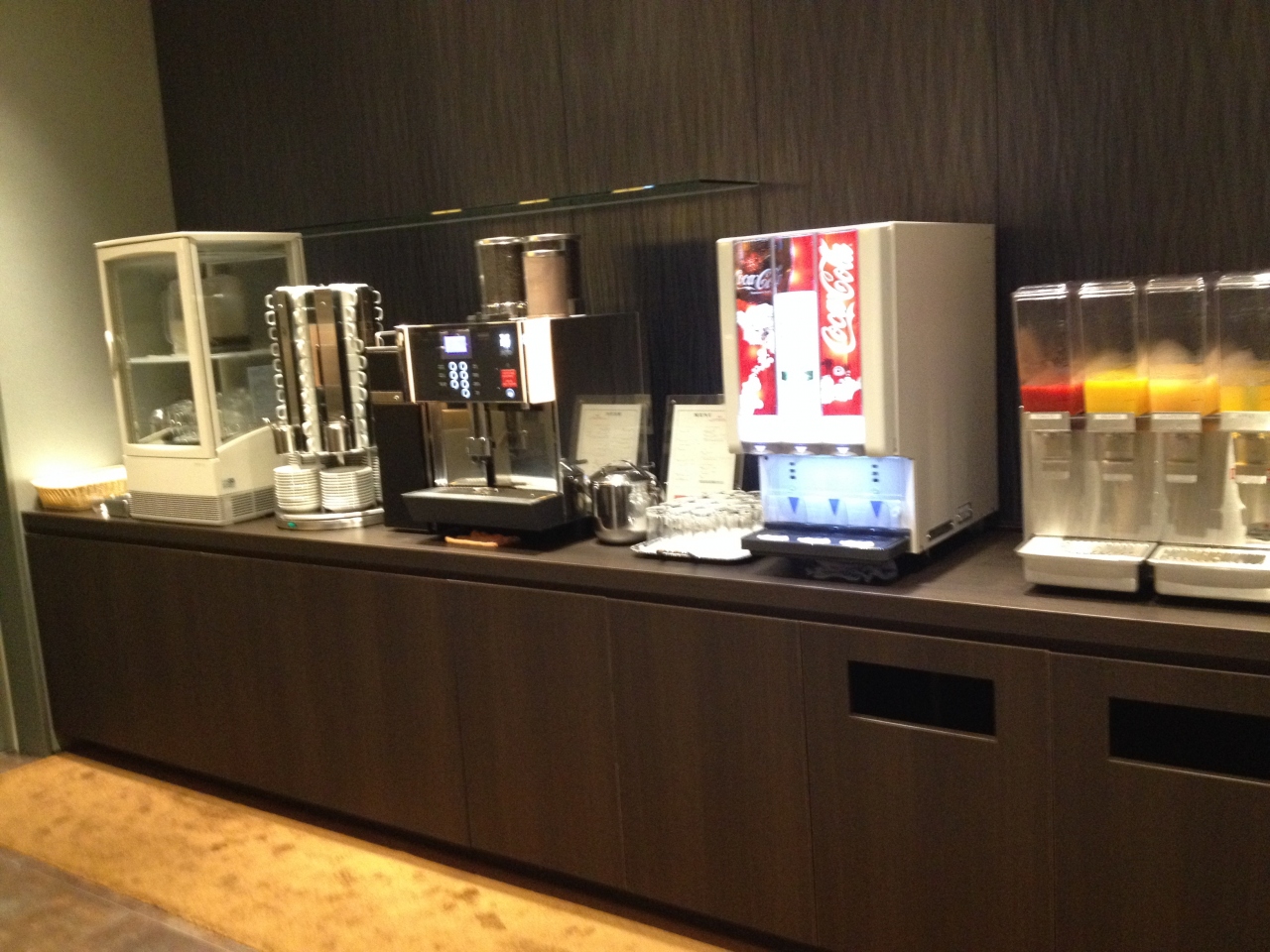 カード会社のラウンジなので、航空会社運営のラウンジとは場所も、内容もかなり異なります。食べ物は一切なく、飲み物オンリー、アルコール類もありません。夏なので炭酸飲料、特にリアルゴールドは珍しいので、大変ありがたかったですけどね。室内はかなり広く、一人一人の座席間スペースがゆったりあります。