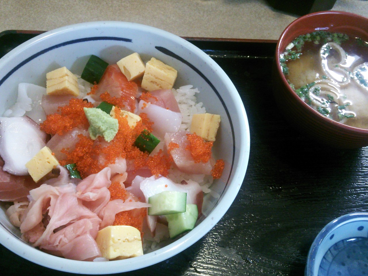 この「漁師丼」、ご飯の上に鮪や鯵、イカ、タコ等が一口サイズに切られたものが綺麗に盛られているという内容で、他に味噌汁が付くという内容でした。味については格段旨いという印象はないけど、まずくもなく普通といった感じでしょうか?