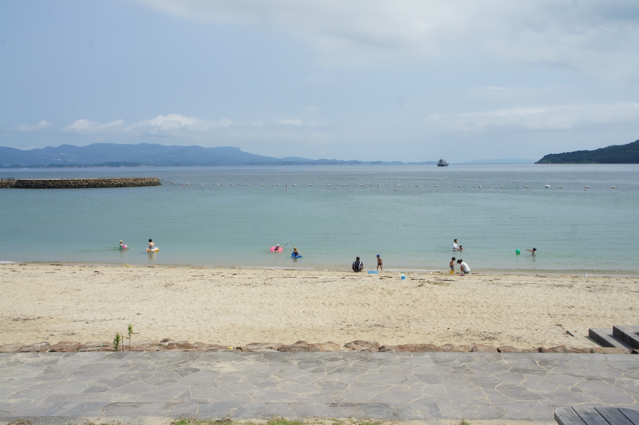 平戸島には、あちこち海水浴場があるのですが、大きさで言えばこの千里ケ浜海水浴場が一番かも。開けた直線の国道沿いに広い駐車場があって、海を臨む高台には巨大ホテルのホテル蘭風。この海水浴場を知らなかった人でも、この景気を見たらちょっと寄ってみたくなると思います。