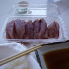マグロの切り身がたくさん入ったパックと、ご飯を買って、お店の前に出してある机でいただきました。