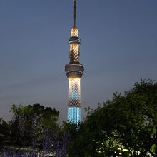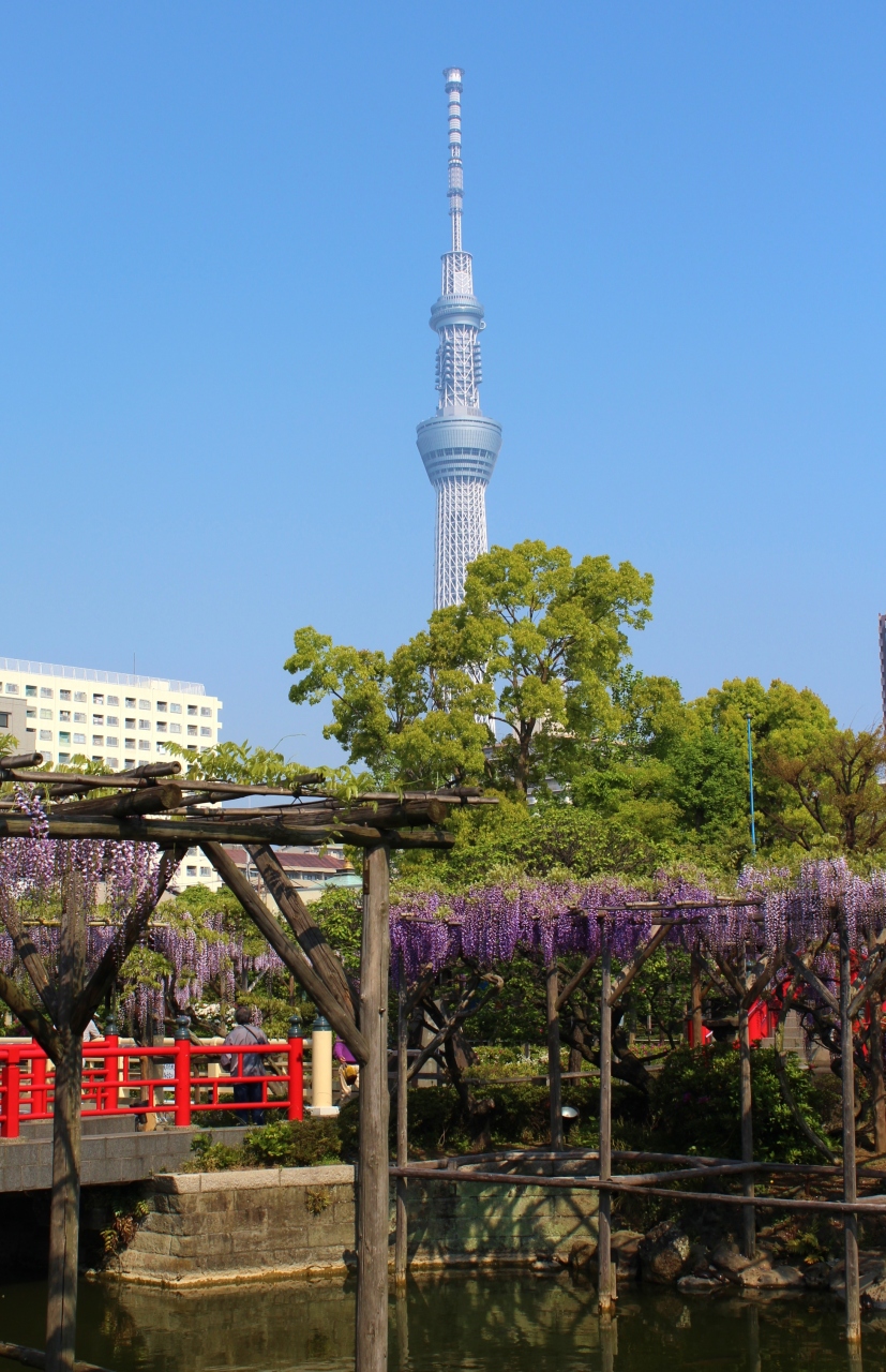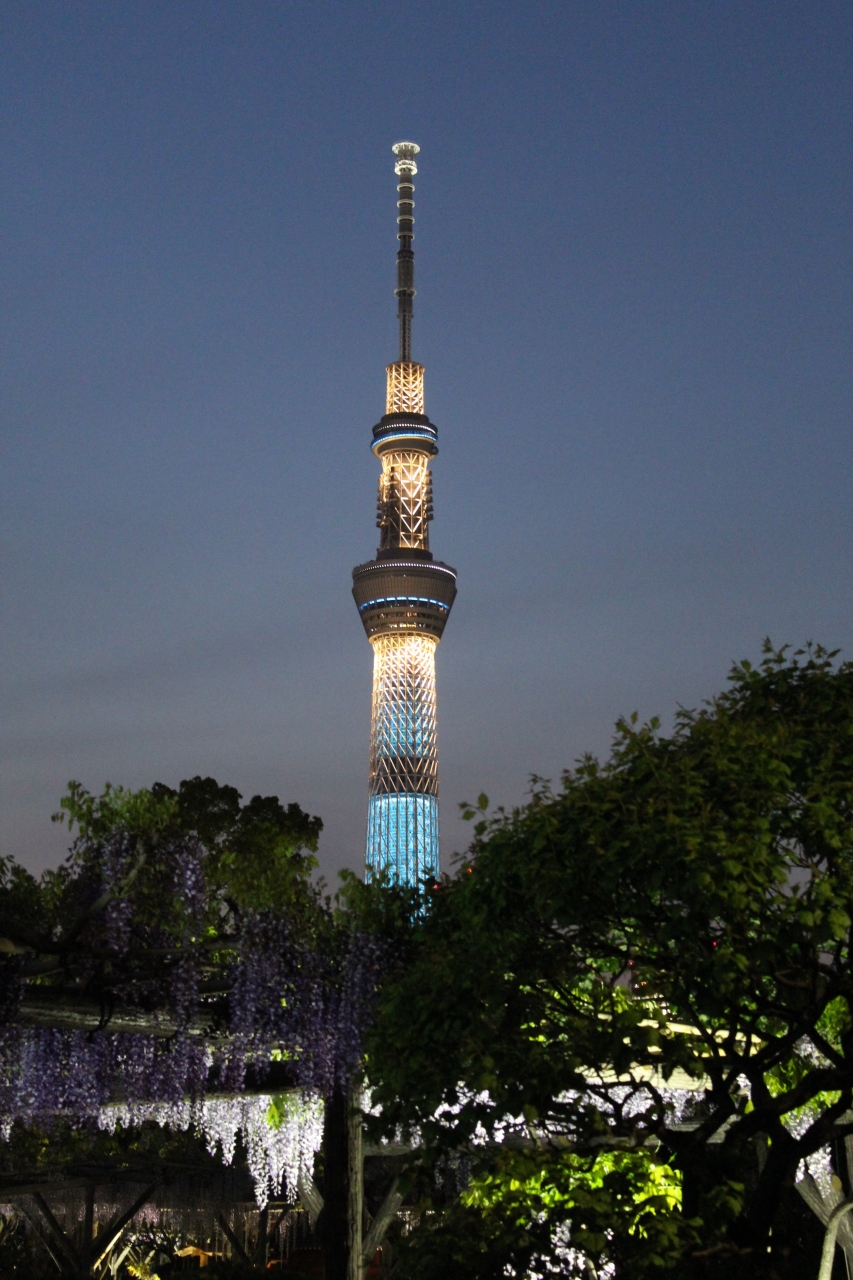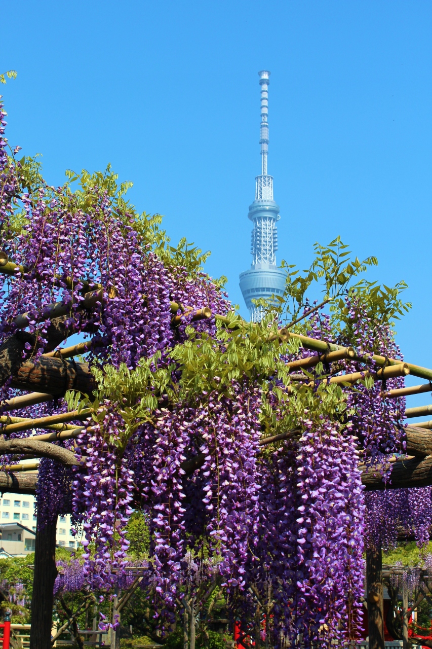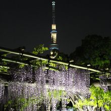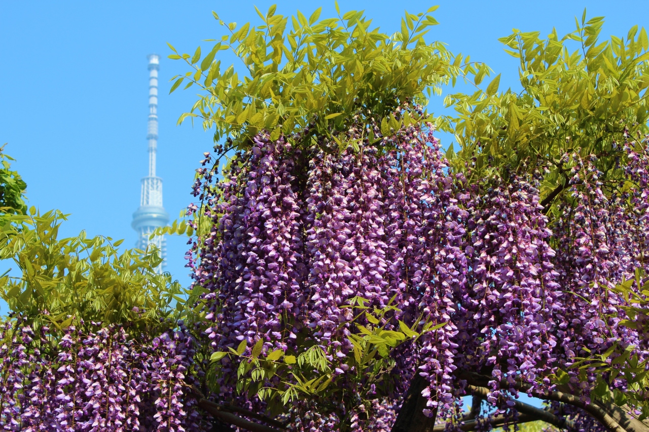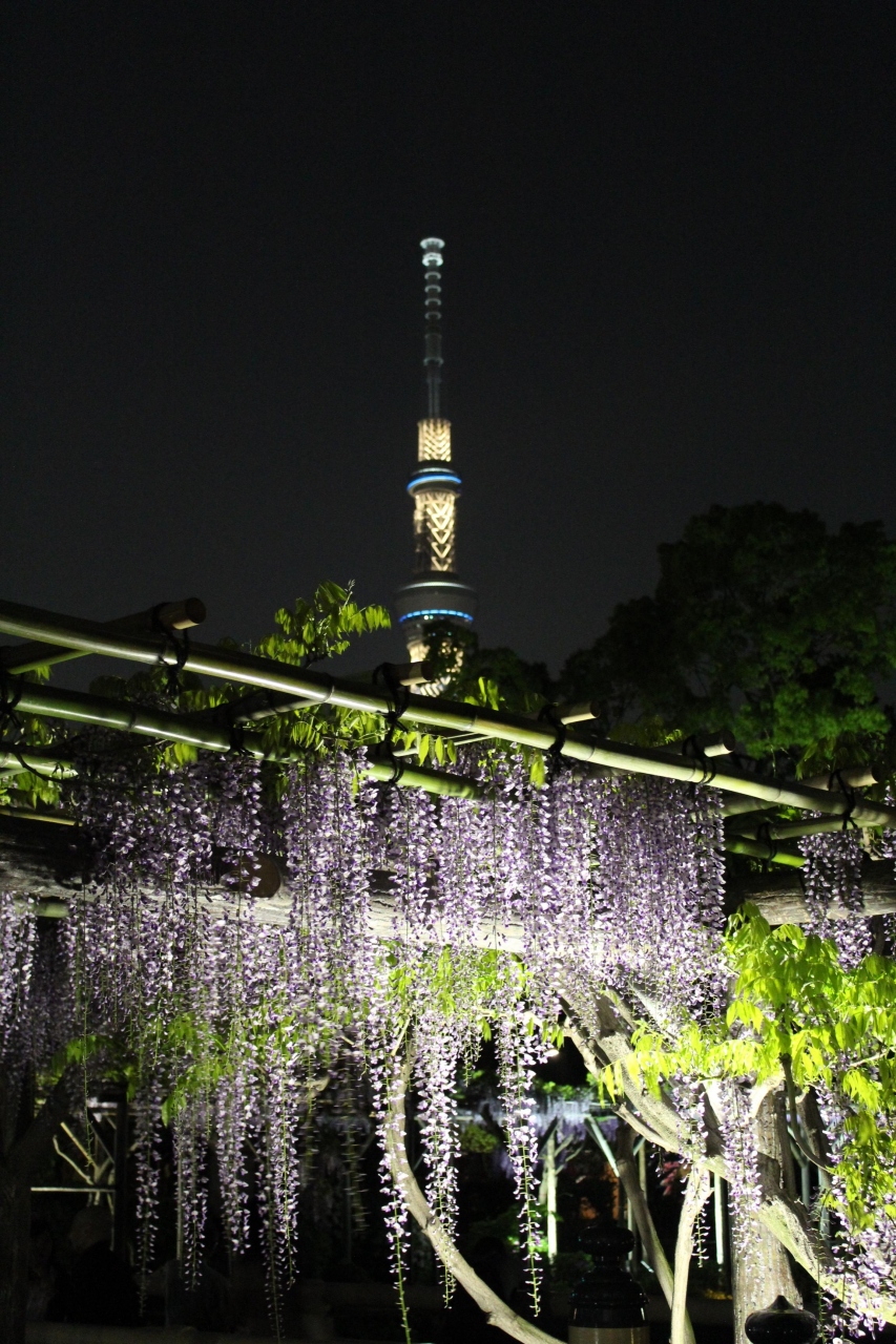 東京スカイツリーは様々なところから望めますが、藤が咲き誇った亀戸天神の境内からもよく見えます。藤の花と東京スカイツリーのツーショット写真を日中とライトアップされた夜間それぞれの趣で撮ることが出来ます。