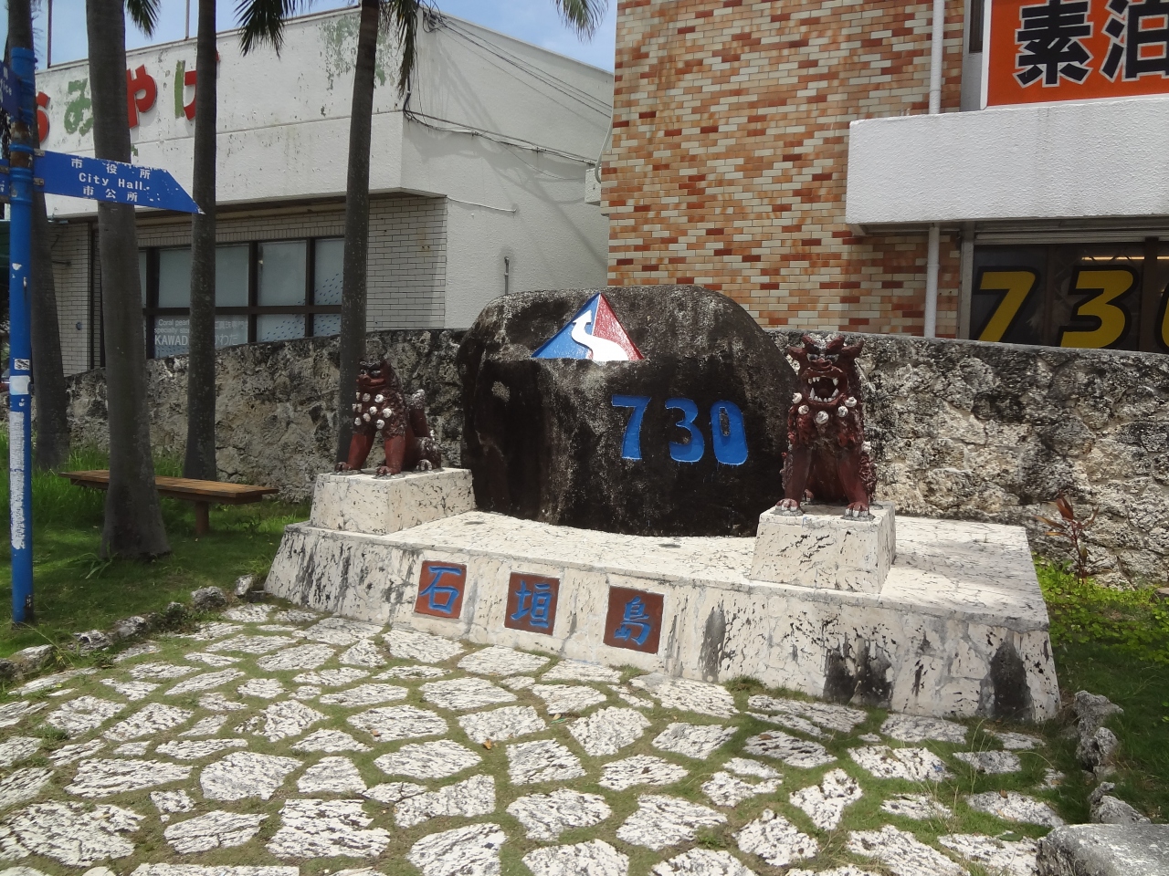 小浜島行きのフェリーにまだ時間があったので離島ターミナル周辺をぷらぷらと散策。しばらく行った交差点に730の石碑を発見しました。戦後アメリカの占領下になった沖縄は一時右側通行でしたが、やがて日本に返還され1978年7月30日をもって県内全域が左側通行に戻ったことに由来されたとのことです。