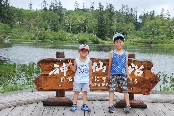 駐車場から20分ほどで静かな神仙沼湿原に到着。途中、すれ違う人たちから「今日は」と挨拶され、初めは戸惑い気味だった孫たちも、やがて元気の良い挨拶が返せるようになってきた。