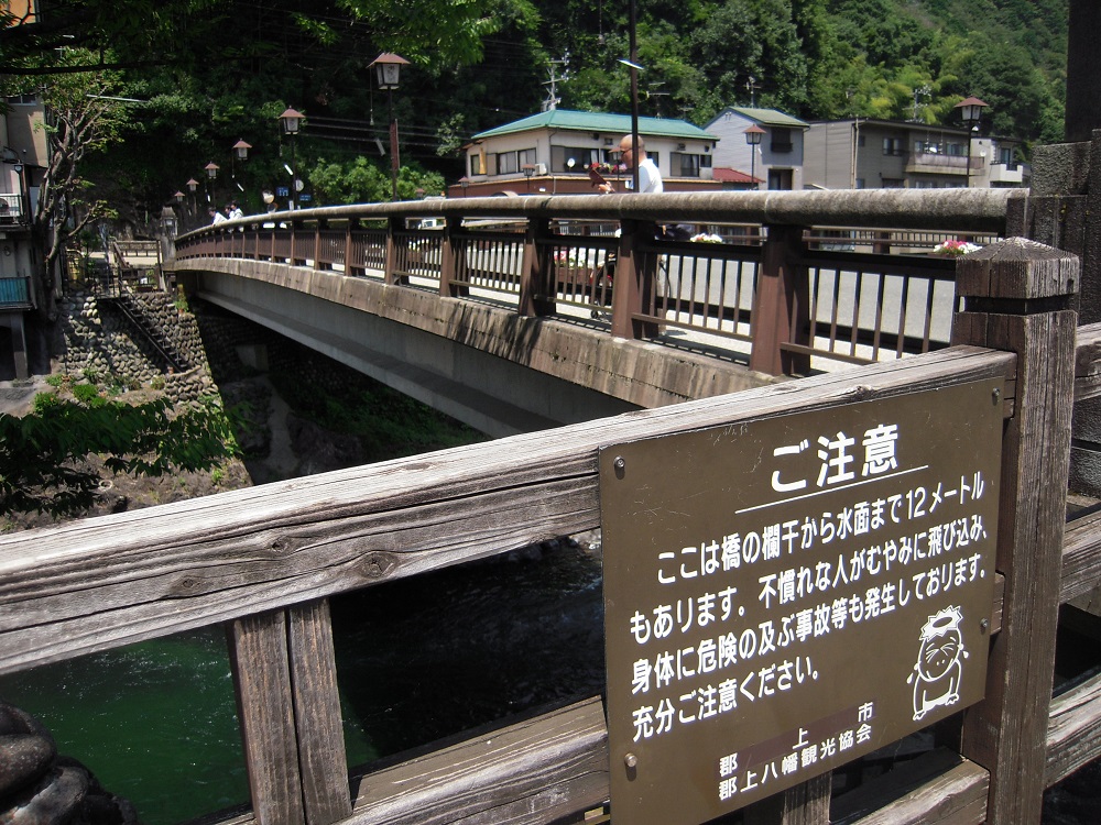 新橋のたもと、左岸側には昔の町役場が 旧庁舎記念館として観光案内所になっており、ここが町の中心と言ってもよいでしょう。新橋から川への飛び込みは郡上八幡のもうひとつの名物となっています。中学生や高校生が度胸試しとして昔から行っていたもので仮装飛び込みのコンテストも行われていたそうです。無茶な飛び方をすると危険とのことで新橋の上には注意書きが書かれていて、水面までの距離は12メートル、十分ご注意くださいとのこと。