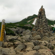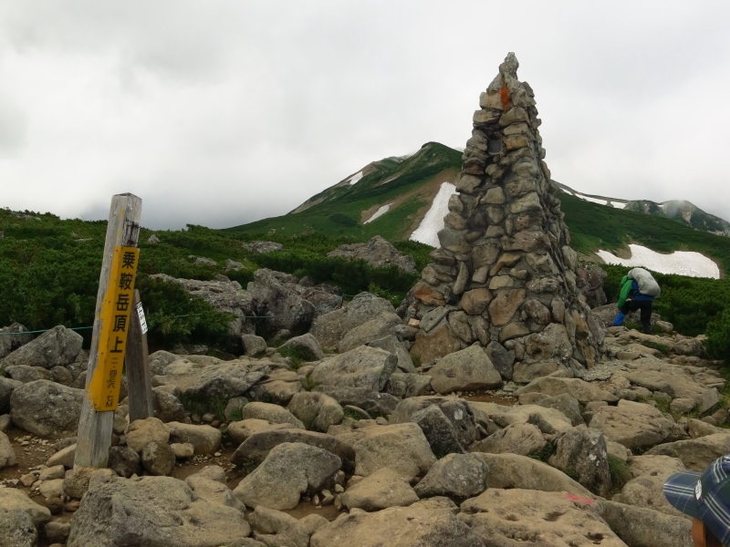 白馬乗鞍岳は2456m、岩だらけの広い山頂に、この山のシンボルでもあるケルンが建っています。このケルンは、眼下の天狗原からも確認できます。