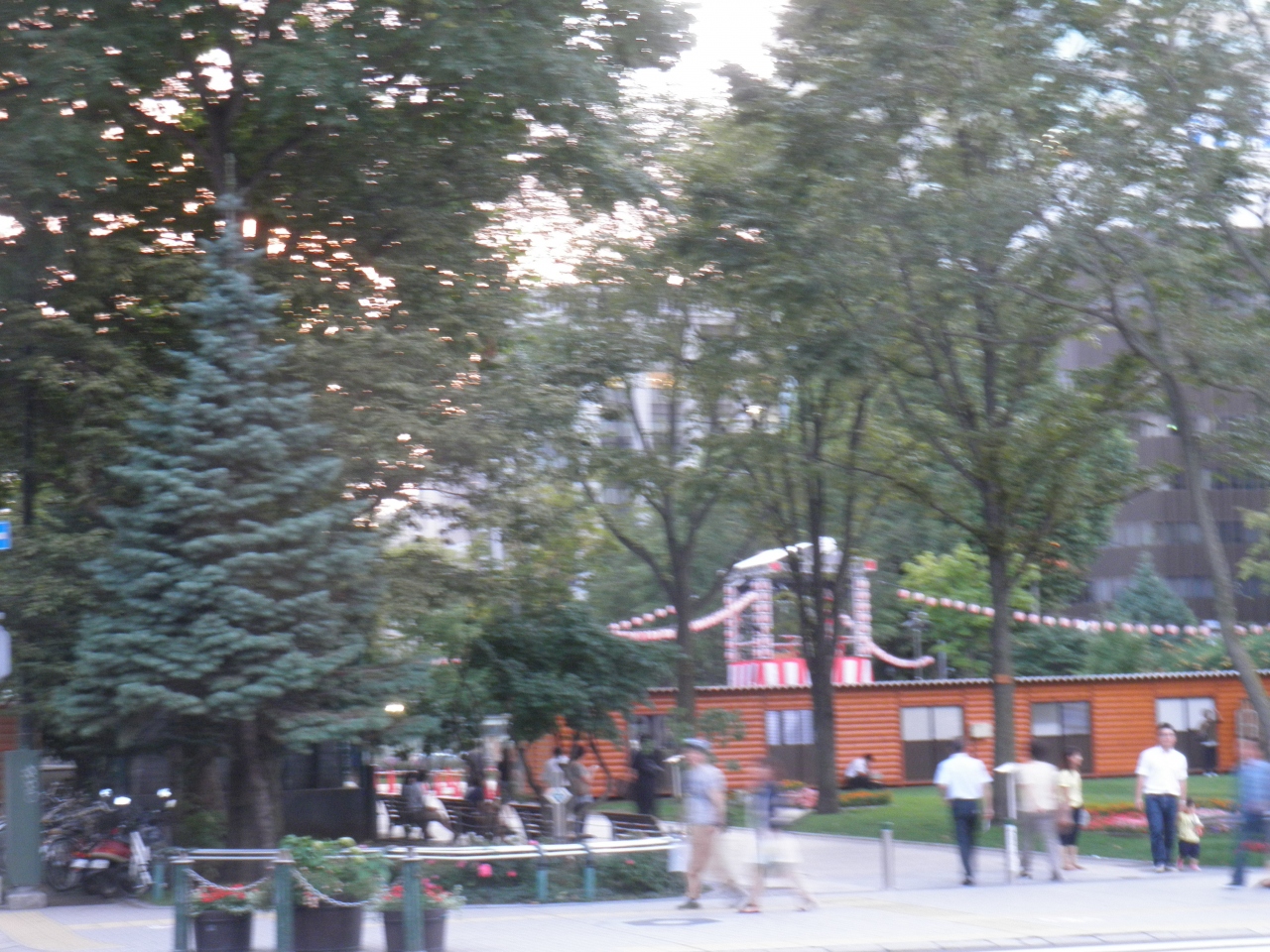 札幌の大通公園は、夏になるとさっぽろ夏祭りの会場になります。 細長い公園の地区ごこに、ビール会社ごとのいろんなビアガーデンができたりして賑わっていました。 市役所の近くには、盆おどりの櫓が建てられて夏祭りらしくなっていました。