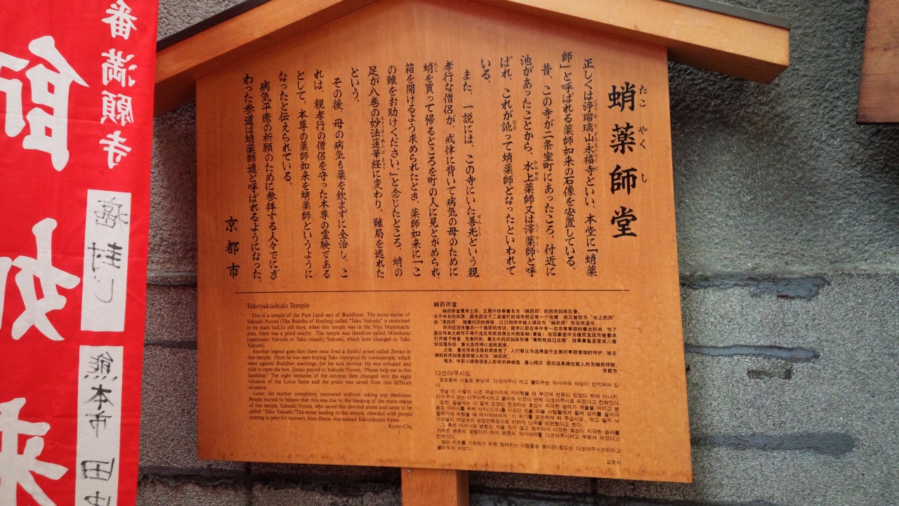 京都の新京極に行きたいという家族の提案でマップを見ていると、蛸薬師堂という名前が出てきましたので、面白い名前でしたので、いろいろ調べました。小さいお堂ではありますが、由緒があり、おできやガン封じに効果があるとのことです。蛸の置物があります。