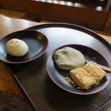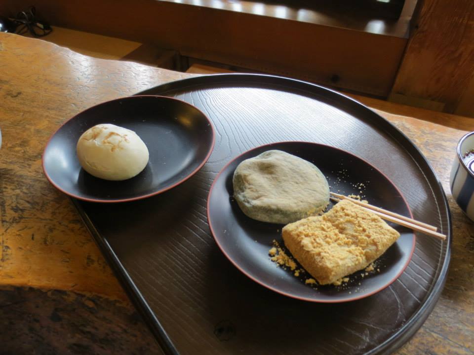 焼き餅(白いのと緑のと2種類あったので緑=よもぎ?を選択)、クルミ餅、甘酒饅頭の3つ選んで、500円未満とお値段は手ごろ。味は、甘すぎないのがいいですね。
