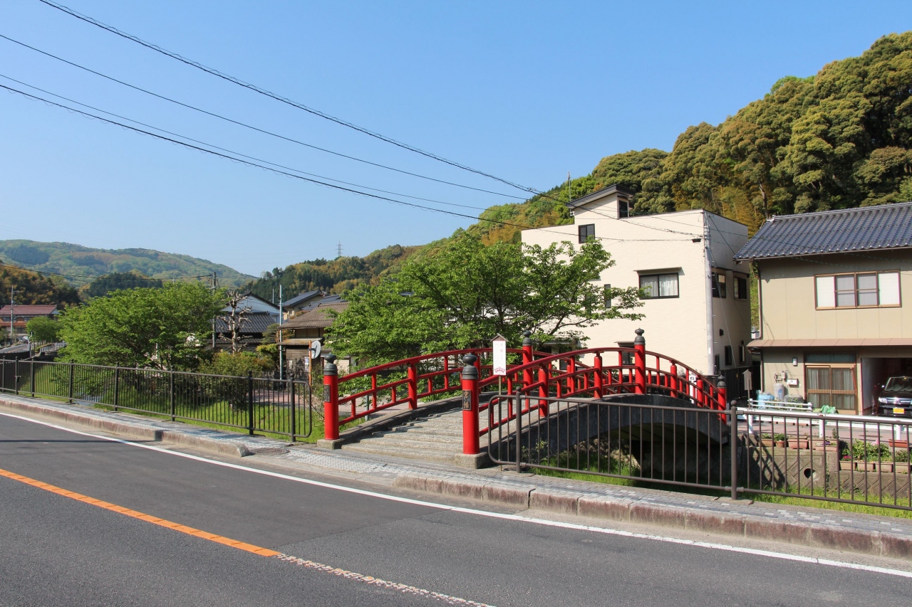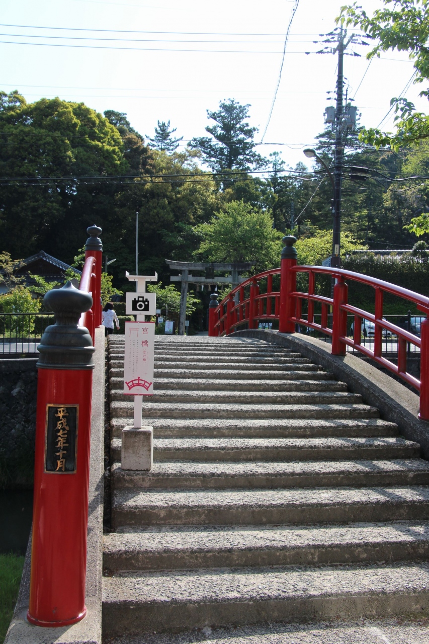 この橋に立ち、神社の鳥居を入れて写真を撮ると