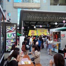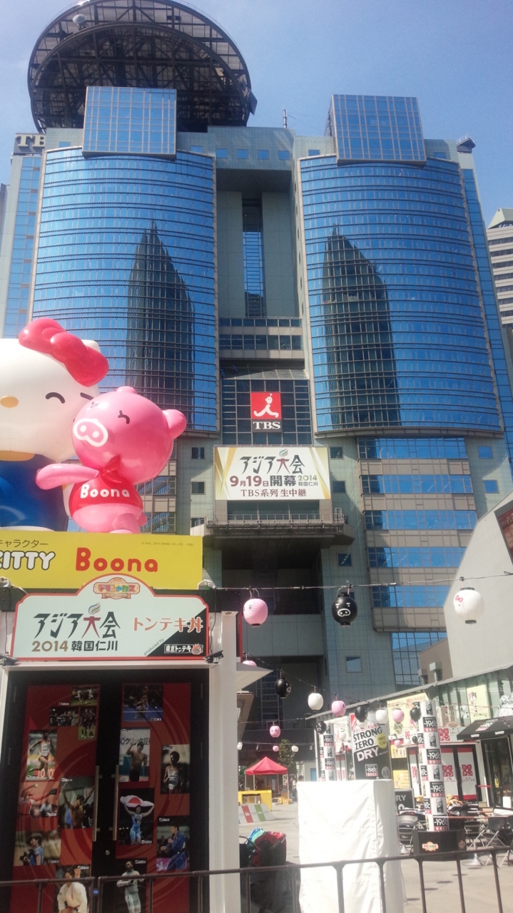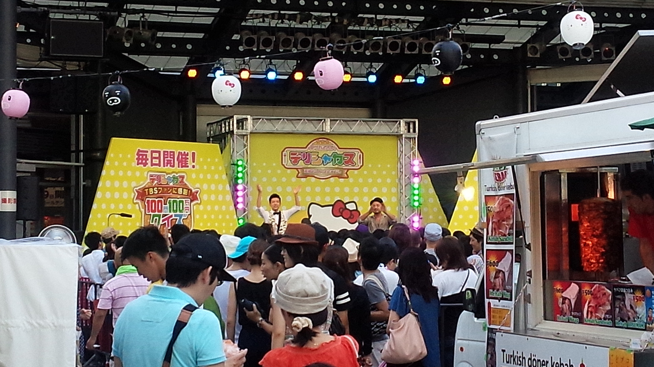 TBS前の野外スペースでは夏サカスのデリシャカスという番組と飲食がコラボした屋台が軒を連ね、昼時は混雑してました。この時期の野外での飲食はメチャメチャ暑いですが、夏を満喫。野外ステージではラジオ番組の生放送で芸人のライブも行われており、盛り上がっていました。