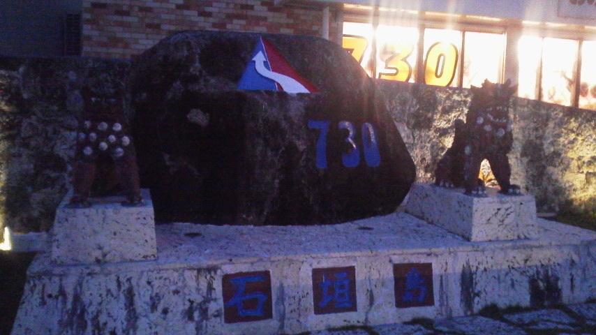 石垣島の市街地の繁華街のシンボル的なスポットというか交差点がここ「730交差点」。ここは、お土産屋さん、飲食店などが立ち並んでいるエリアと石垣港離島ターミナルとの曲がり角にあります。ユーグレナモールやこのエリアでブラブラ散策していたら、交差点というか信号の角に石碑があります。離島への日帰り観光などの帰りに、ショッピングや食事をする際には、この交差点を経由するパターンが多いですね。