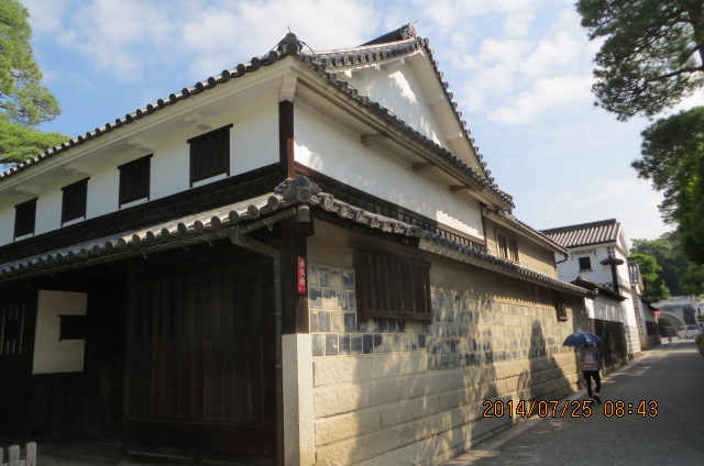 場所は、大原美術館前の倉敷川に架かる今橋を渡り、直ぐ左側にあります。右側は有隣荘です。建設時期は江戸時代とのことですが、流石は綿仲買商人として有名であった大原家だけに、倉敷窓、倉敷格子、白壁などが今でも立派で、往時の繁栄を想像出来ます。