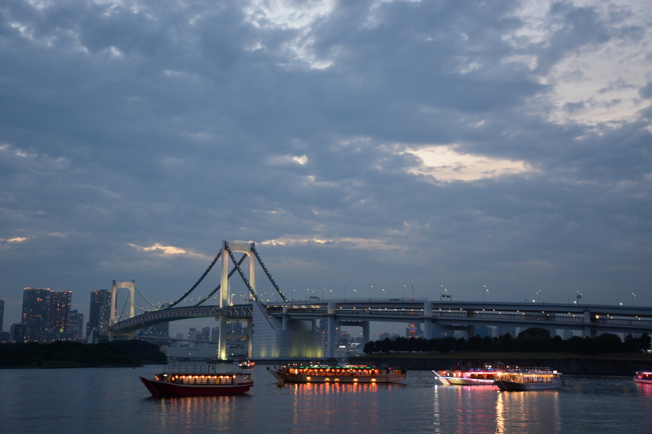 お台場側から、都心の手前にレインボーブリッジを眺められます。