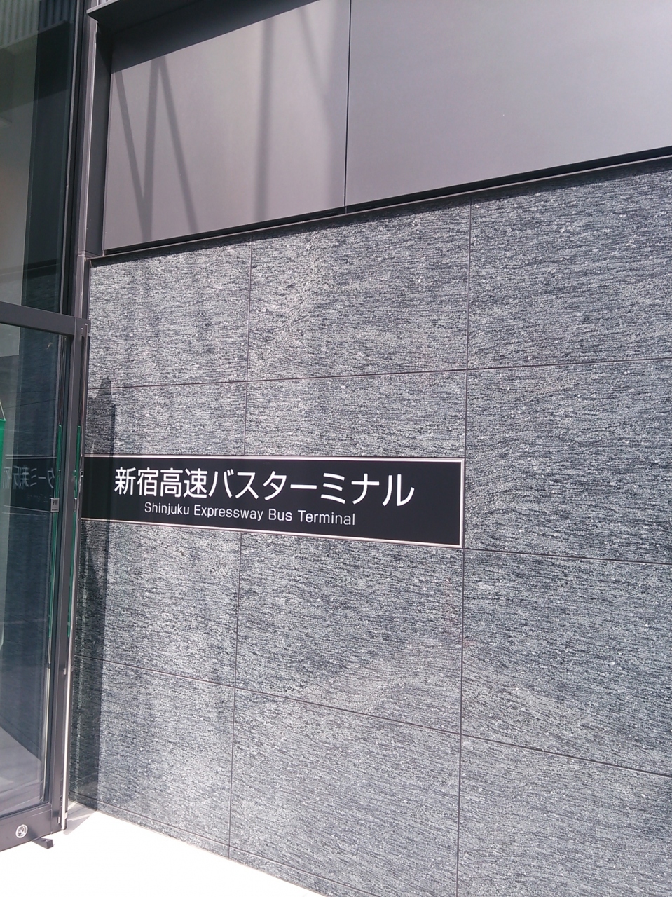 新宿駅西口のヨドバシカメラの近く。バスターミナルとはいっても、ビル一階にバスが二台分位とめられるスペースがあるだけで、人混みをかき分けて出発しているので、運転手や警備員は大変そう。写真は待ち合いスペースで乗車券の購入等ができる。エアコンがきいているので、関係なさそうな人もいる。