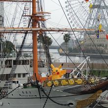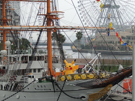 メモリアルパーク内に展示してある日本丸です。桜木町の駅からはすぐのところにあります。本物です。年に数回、帆をはる訓練も行っているそうです。今回はピカチュウのイベントのため、ピカチュウ一色に染められていました。有料ですが、乗船することもできます。