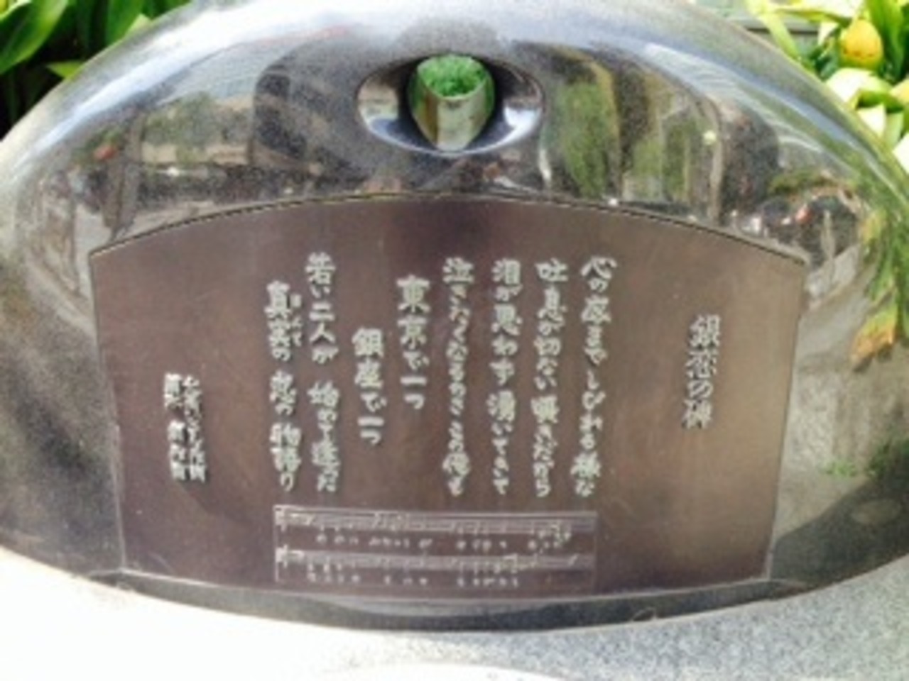 有楽町の西銀座チャンスセンターのあるNISHI GINZAの前にある。言わずと知れたデュエット曲の最高峰の曲だ。よく見ると、歌碑の前の左右にふたつ窪みがあり、ここに座って記念写真が撮れるようになっている。