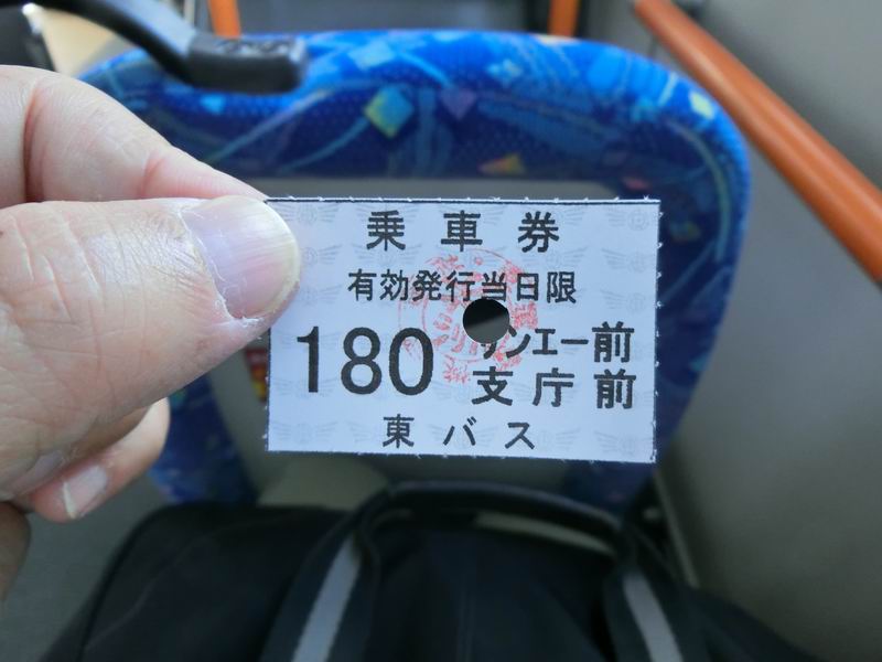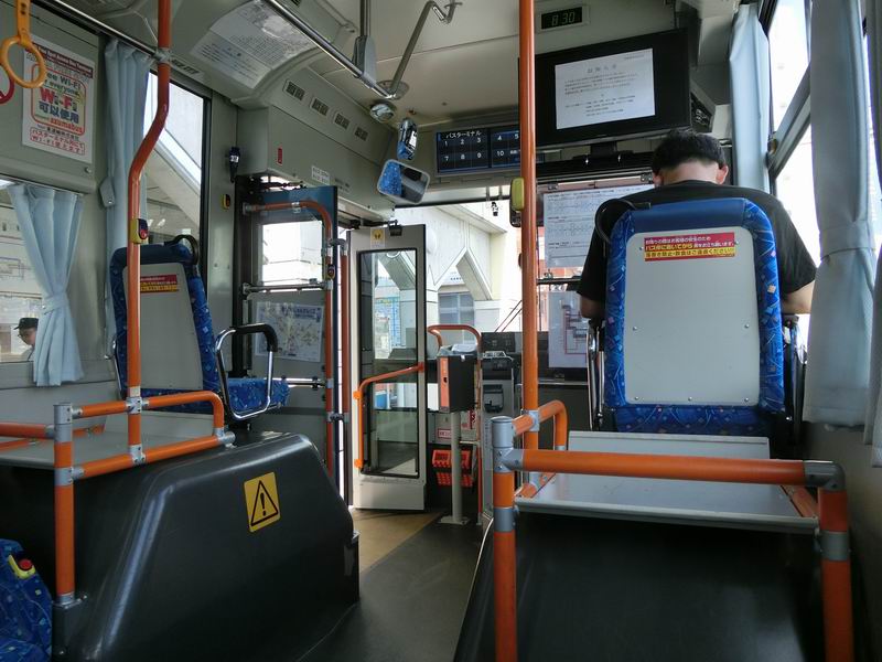 空港アクセスでの利用ではなく、バスターミナル~八重山支庁前 間の利用です。前乗り前降りで、後ろのドアは車いすの方が乗車する際に開きます。整理券方式ですがバスターミナルから乗車する時は窓口で乗車券を購入してから乗車となります。地元の人の移動手段でもあるため、空港線を走る車両であっても普通の路線バスと同じタイプの座席配置で、スーツケースを置くような場所は特に設けていないように見えました。