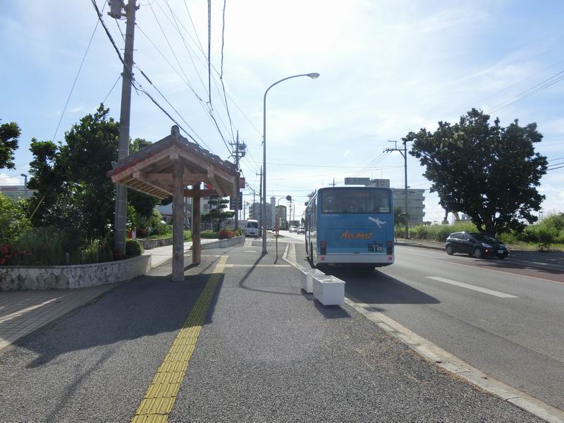 空港アクセスの系統は、ANAインターコンチネンタルリゾートとホテル日航八重山を経由するルートと、経由しないルートの大きく2つ。経由するバスのうち半分くらいは準急便と呼ばれるANAインターコンチネンタルリゾートと空港の間がノンストップの便で所要時間が短いです。逆にかりゆし倶楽部を経由する便が朝夕にあり、こちらは数分余計にかかります。バスターミナル~空港間は所要時間40~50分。料金は540円。空港のバス停からだと2系統合わせると15分間隔で出ています。旧空港に比べて遠くなったので時間に余裕をもって動いたほうが良いでしょう。