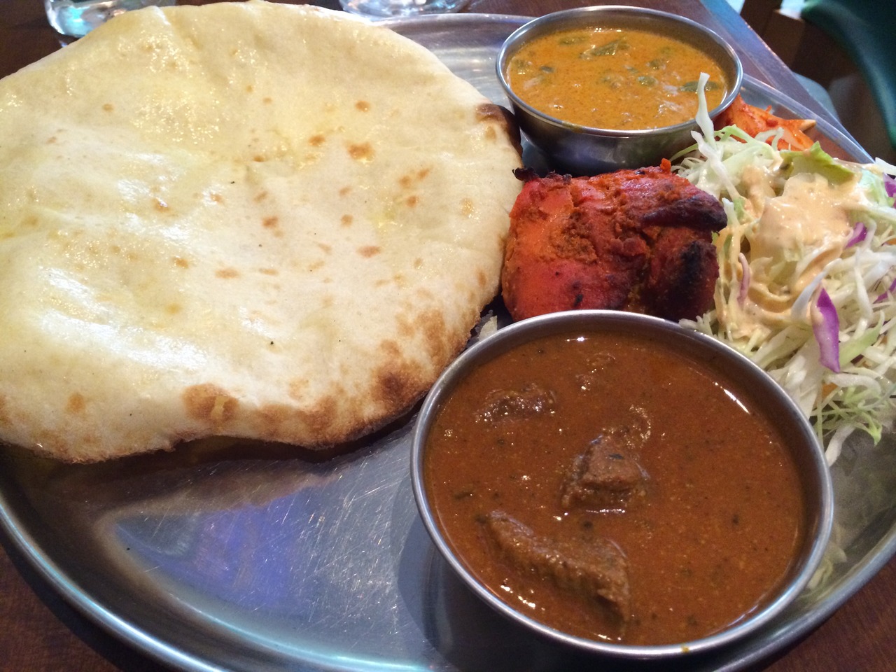 カレー2種、タンドリーチキン、サラダ、ナンorライス、飲み物のBセット@1,100円。